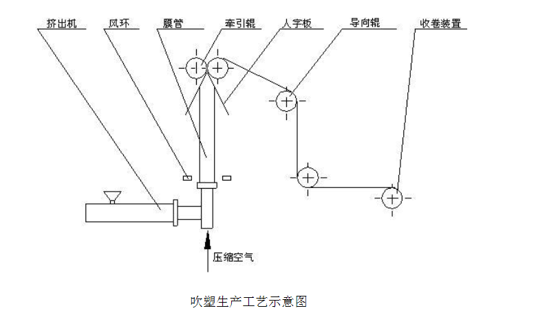 树脂经挤出机熔融塑化,从环形机头垂直向上引出,经吹胀后由人字板导入牵引辊,再经导向辊及卷取装置得到成品。