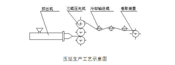 树脂经挤出机熔融塑化,从机头通过狭缝型模口挤出,经三辊压光及压延、冷却,再经过冷却输送辊及卷取装置得到成品。