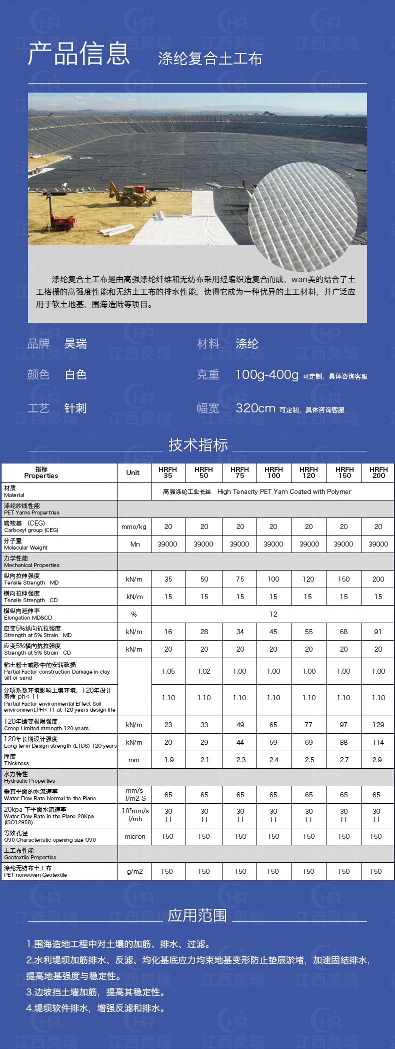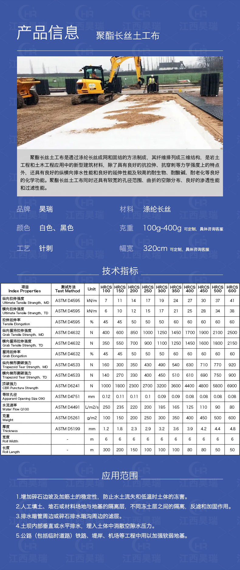 5.围海造地工程中对土壤的加筋、排水、过滤。4.排水暗管周边或碎石排水暗沟周边的滤层。
